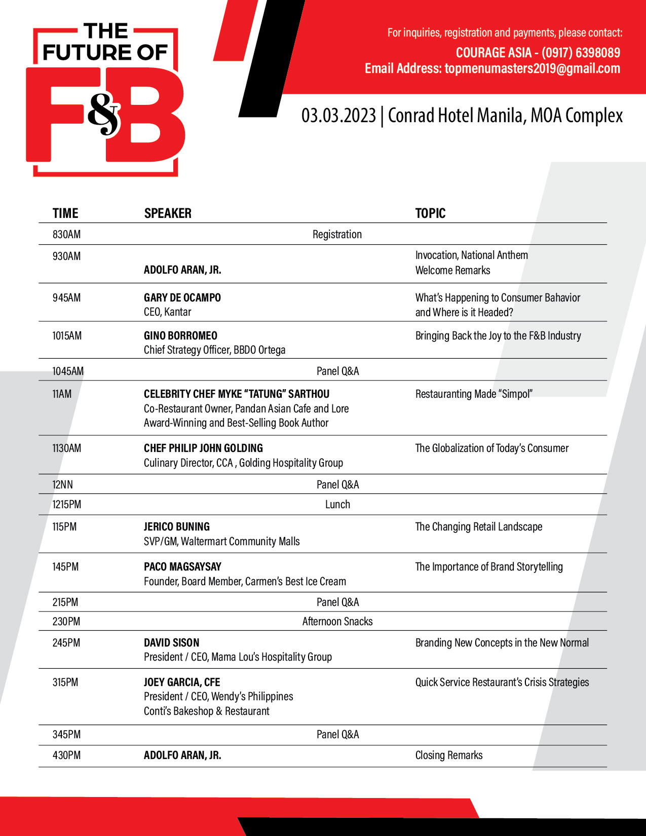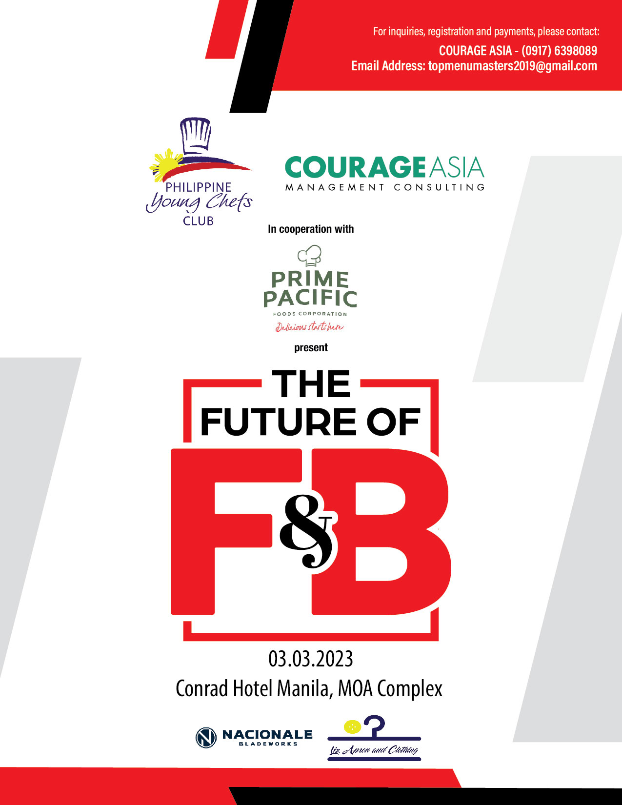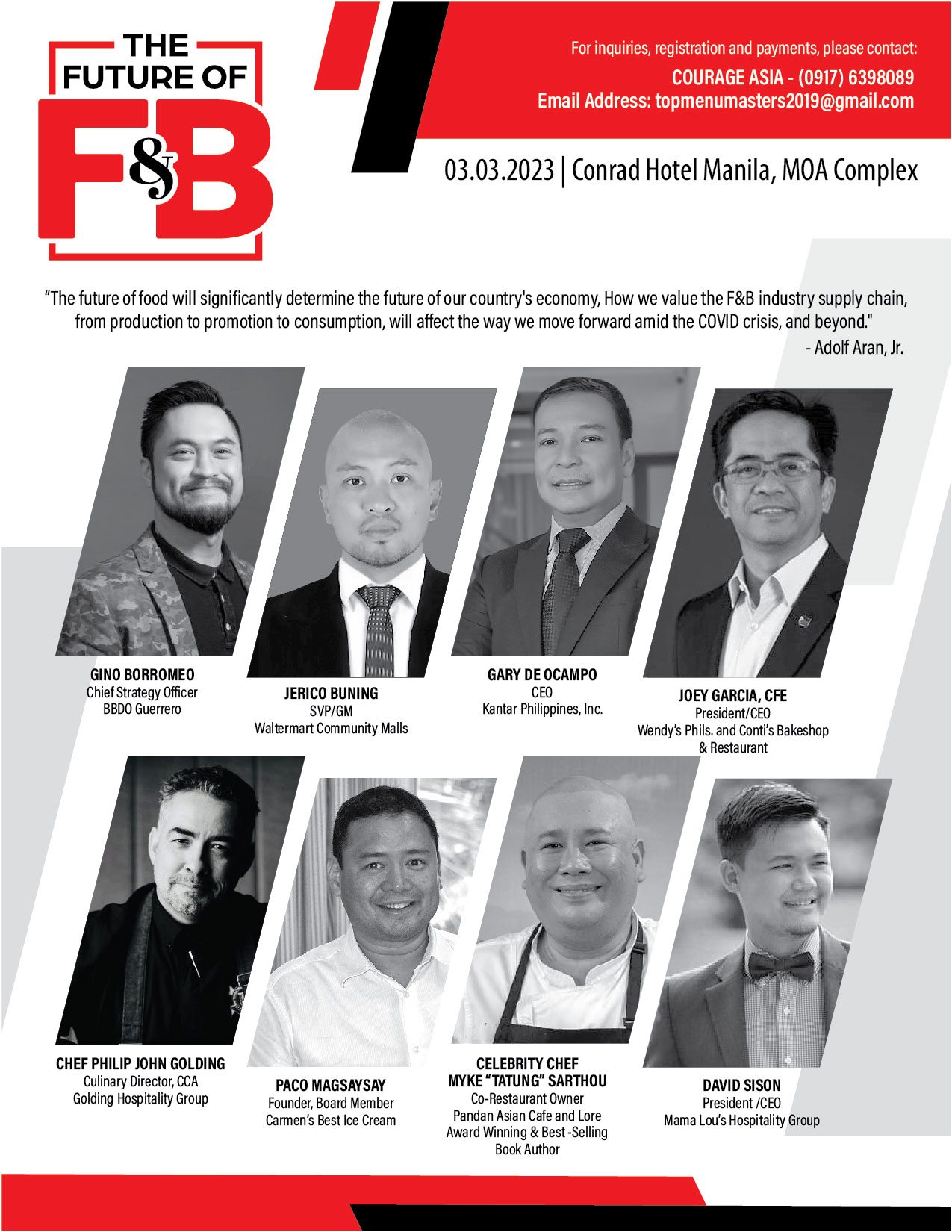 If you’d love to know more, you can listen to The Future of F&B, where Chef Philip is speaking on the topic, ‘The Globalization of Today’s Consumer,’ on March 3, 2023, at Conrad Hotel Manila, MOA Complex. In addition, you can register through the following: Courage Asia – 0917 639 8089 or topmenumasters2019@gmail.com.